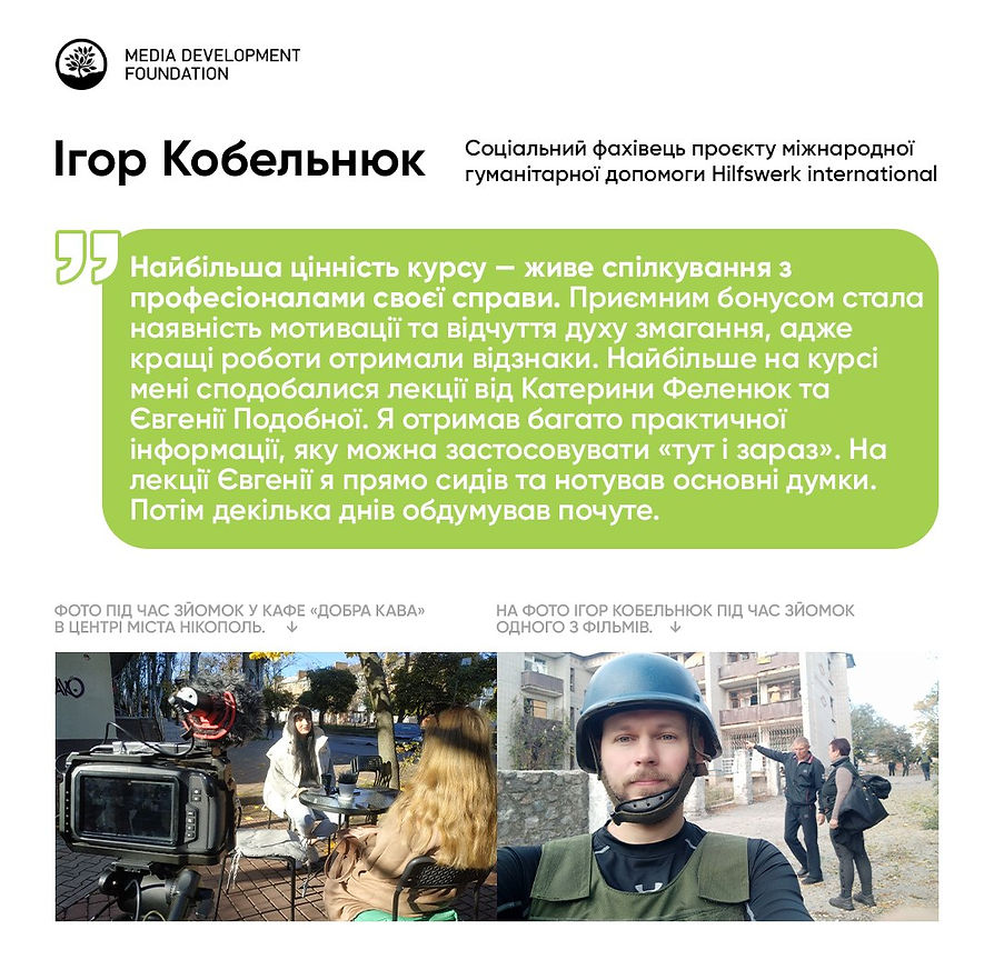 В кінці серпня 2023 року я подав заявку на практичний курс зі створення документальних фільмів від Media Development Foundation. Після розгляду з поміж 92 претендентів, мені вдалося пройти й тепер я потрапив у десятку людей, які потрапили на це навчання. Після трьох місячного процесу зйомок та монтажу 28 листопада 2023 року в Києві пройшла презентація фільму про Нікополь, який ми робили разом з моєю дружиною Мариною Кобельнюк. Ми виграли приз за найкращий документальний фільм «Один день з життя незламних нікопольців» та отримали 1 800 € грошового призу.